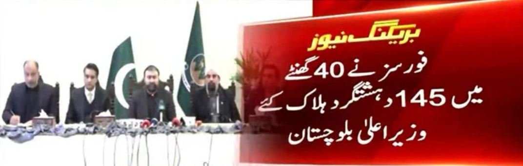 Balochistan Chief Minister Sarfraz Bugti on Sunday said Pakistan security forces eliminated 145 terrorists following attacks in the province on Saturday, Beyond the Time News reported.